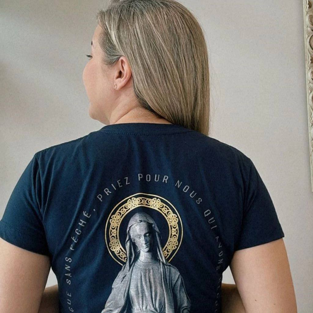 A baby look apresenta um visual impactante e reverente, com a imagem de Nossa Senhora das Graças estampada nas costas. A figura da Virgem Maria está retratada em estilo clássico, com vestes longas e braços estendidos para baixo, em um gesto de acolhimento e bênção. Seu semblante sereno e cheio de graça transmite devoção e paz.