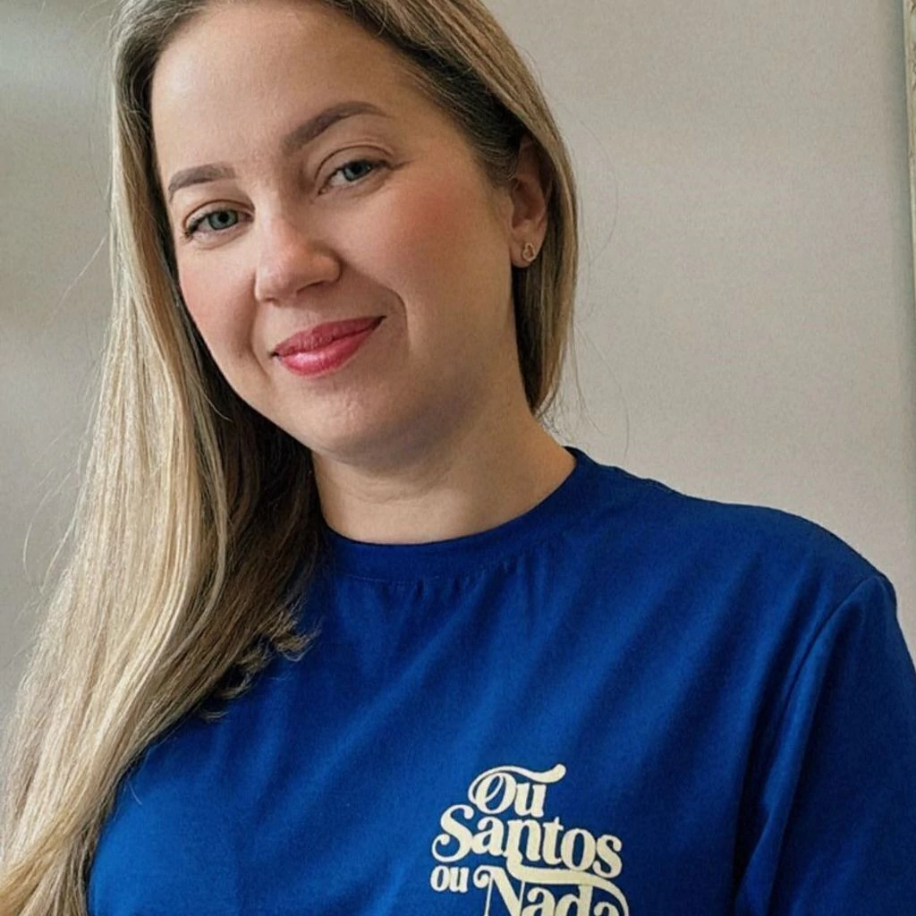 Frente: Frase "Ou Santos ou Nada" no peito em azul, simbolizando a santidade.